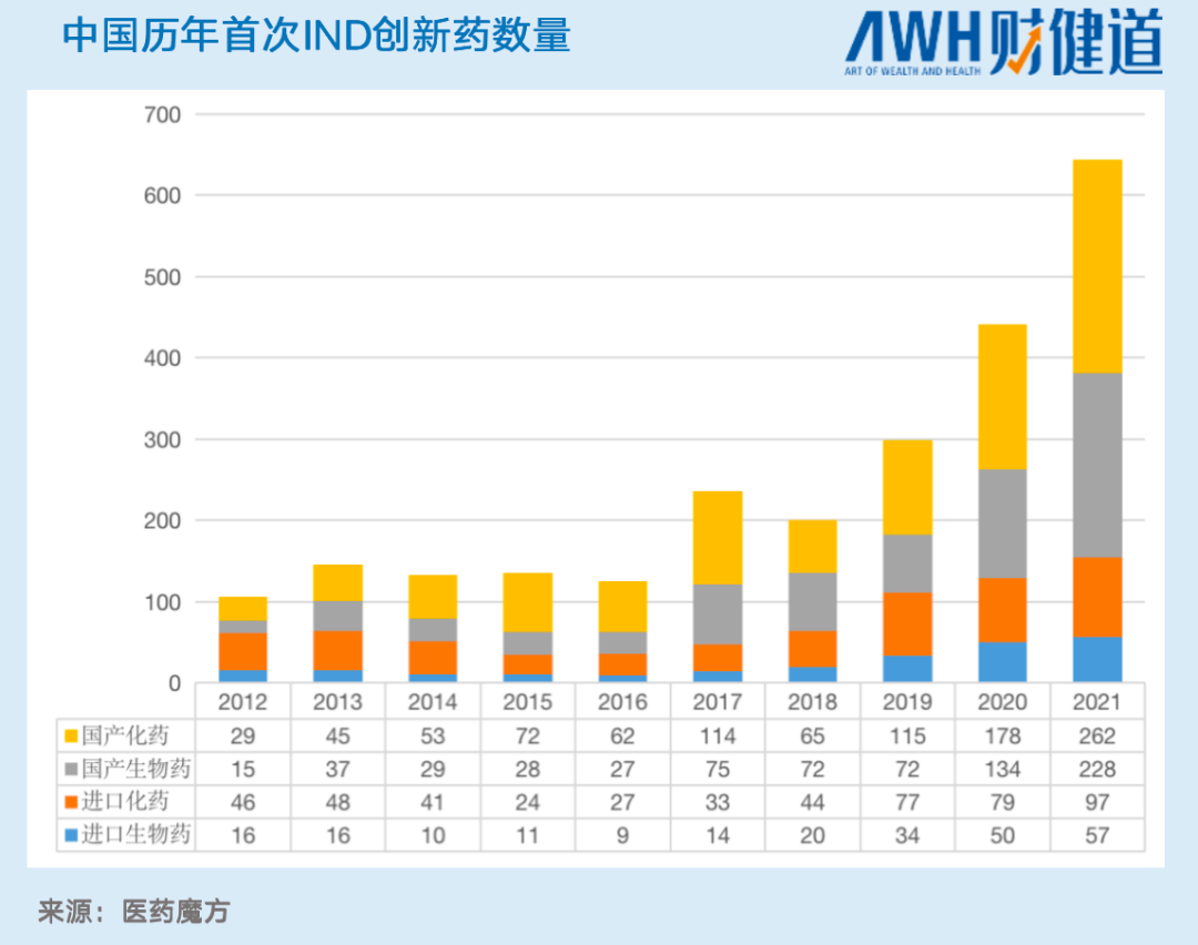 2016年,中國(guó)創(chuàng)新藥企剛剛拉開(kāi)初登舞臺(tái)的序幕。多年以來(lái),無(wú)論是IND(新藥臨床研究)還是NDA(新藥上市申請(qǐng)),進(jìn)口藥物在國(guó)內(nèi)創(chuàng)新藥的品種中都占得“半壁江山”;但2017年以后,國(guó)產(chǎn)IND新藥數(shù)量逐年增長(zhǎng),2019年-2021年總體CAGR(復(fù)合年均增長(zhǎng)率)達(dá)47%,2021年國(guó)產(chǎn)藥品更是占比達(dá)76%,國(guó)產(chǎn)化藥、生物的發(fā)展勢(shì)頭與往日大不相同。