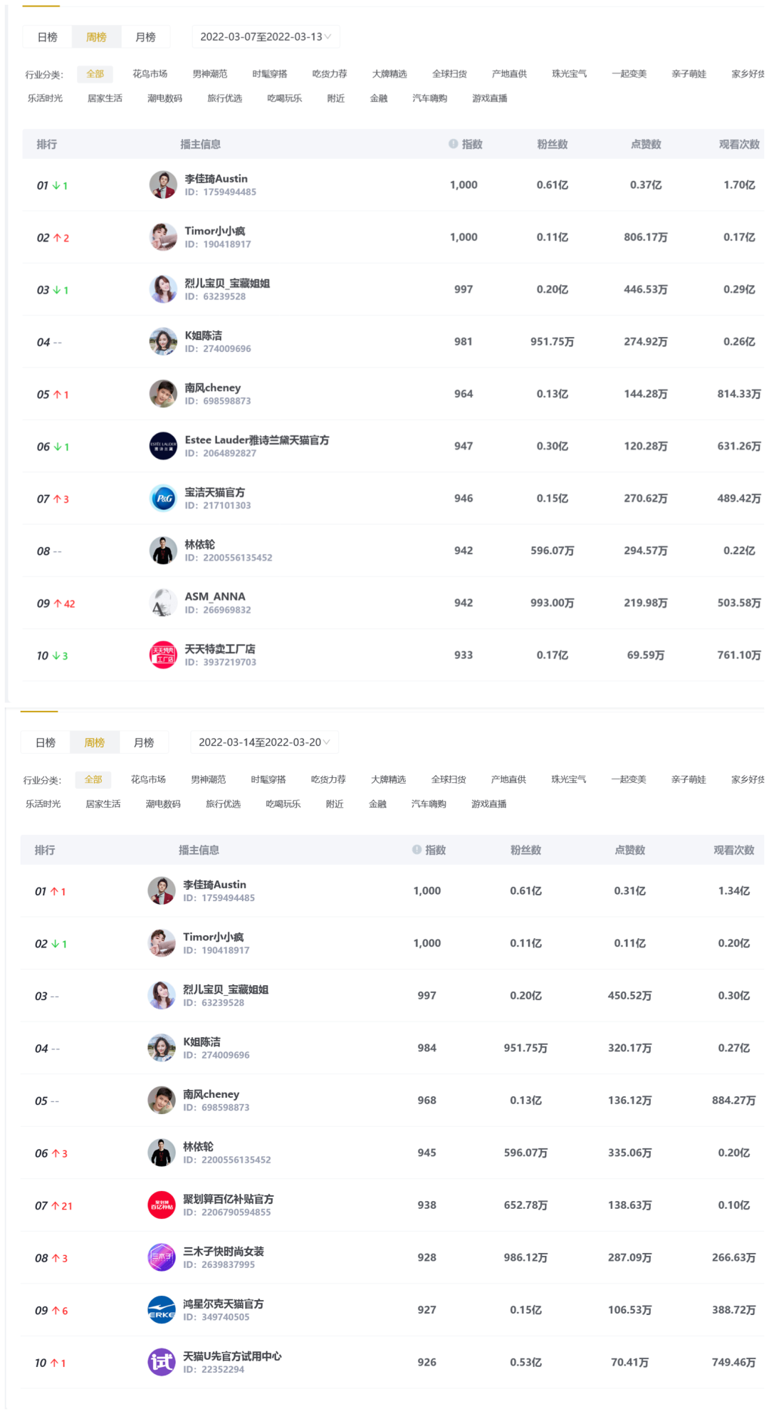 3月數(shù)據(jù)顯示,在李佳琦開播日,淘寶直播帶貨日榜冠軍沒有懸念。當月李佳琦開播25天,霸榜日冠25次。6天未開播日,榜首位置則分屬“烈兒寶貝”“K姐陳潔”等頭部主播。同時,李佳琦Austin、Timor小小瘋、烈兒寶貝、K姐陳潔、南風cheney等5大主播幾乎包攬了3月份周榜前5名的位置,甚至次序都未發(fā)生過改變。