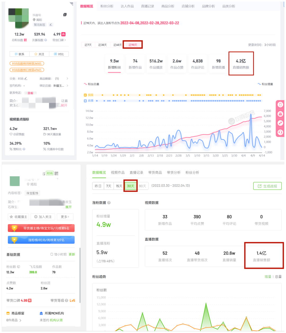 抖音某珠寶玉石主播,目前擁有粉絲12萬+,但近30天直播帶貨銷售額1.4億元,近90天直播帶貨銷售額4.2億元。