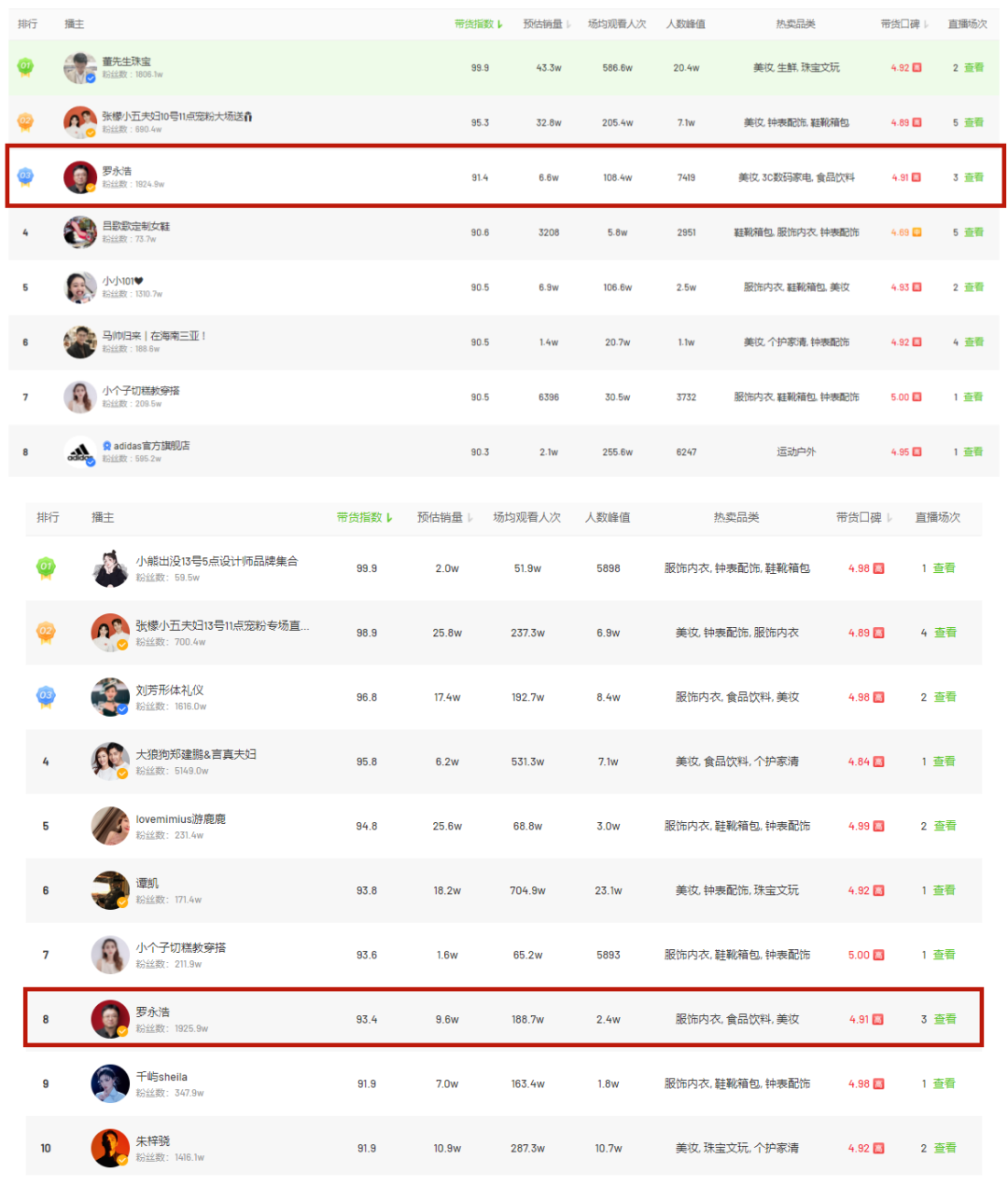 在月榜方面,羅永浩雖然仍然還是月榜冠軍,但完全是憑直播時長取勝。1月-3月,1900多萬粉絲的羅永浩直播間,共進行直播120多場,完成GMV11.19億元,場均1000萬元左右。這樣的成績與300余萬粉絲主播的直播間基本持平。同時,粉絲10萬左右的主播直播間,也可能達成單場1000萬元,場均300萬元銷售的“奇跡“。