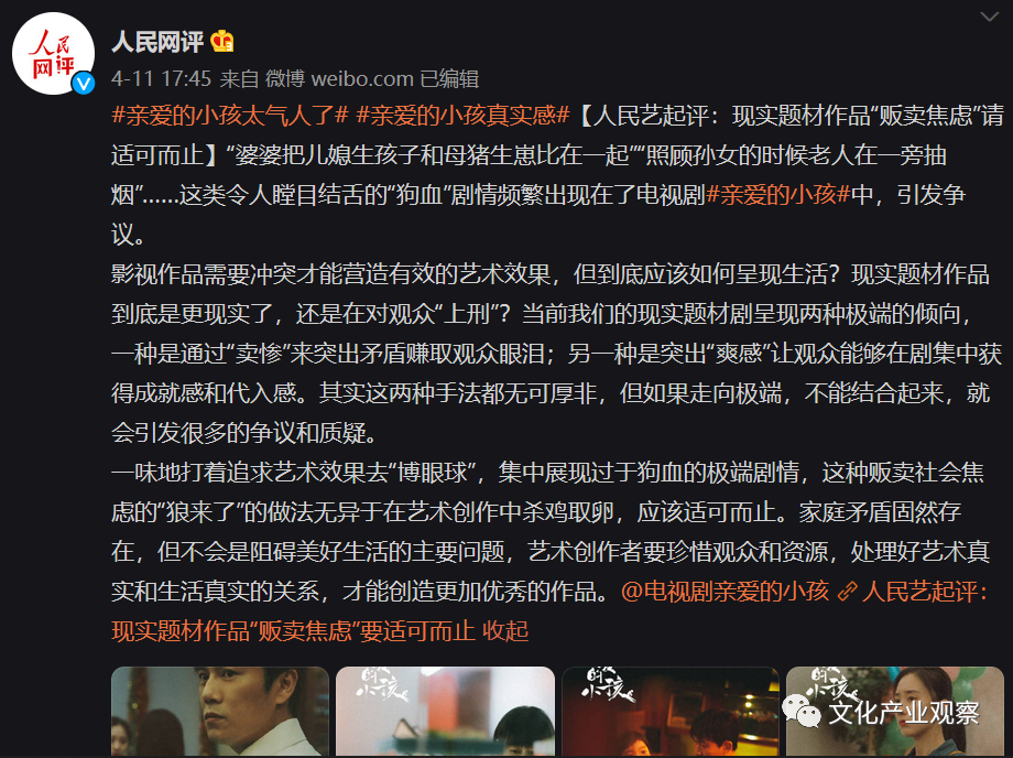 最近,逃過了“不接地氣”和“熱搜效應”的熱播劇《親愛的小孩》,引發(fā)了關(guān)于影視劇作品內(nèi)容與商業(yè)關(guān)系的新討論。