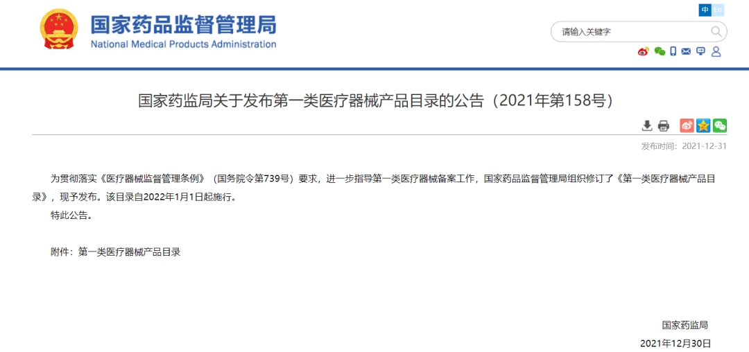 同日,關于實施《第一類醫(yī)療器械產品目錄》(下稱“新《一類目錄》”)有關事項的通告發(fā)布,其中提到:自2022年1月1日起,第一類醫(yī)療器械均應當按照新《一類目錄》實施備案。