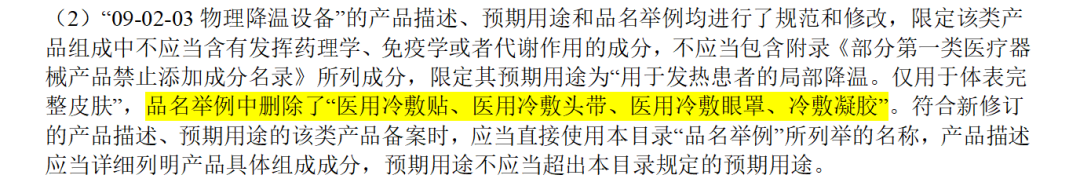 與行業(yè)相關的重點包括,針對第一類醫(yī)療器械,國家藥監(jiān)局限定了09-02-03物理降溫設備的產品用途和范圍,刪除“醫(yī)用冷敷貼、醫(yī)用冷敷頭帶、醫(yī)用冷敷眼罩、冷敷凝膠”的品名舉例,刪除了液體敷料、膏狀敷料的有關內容。
