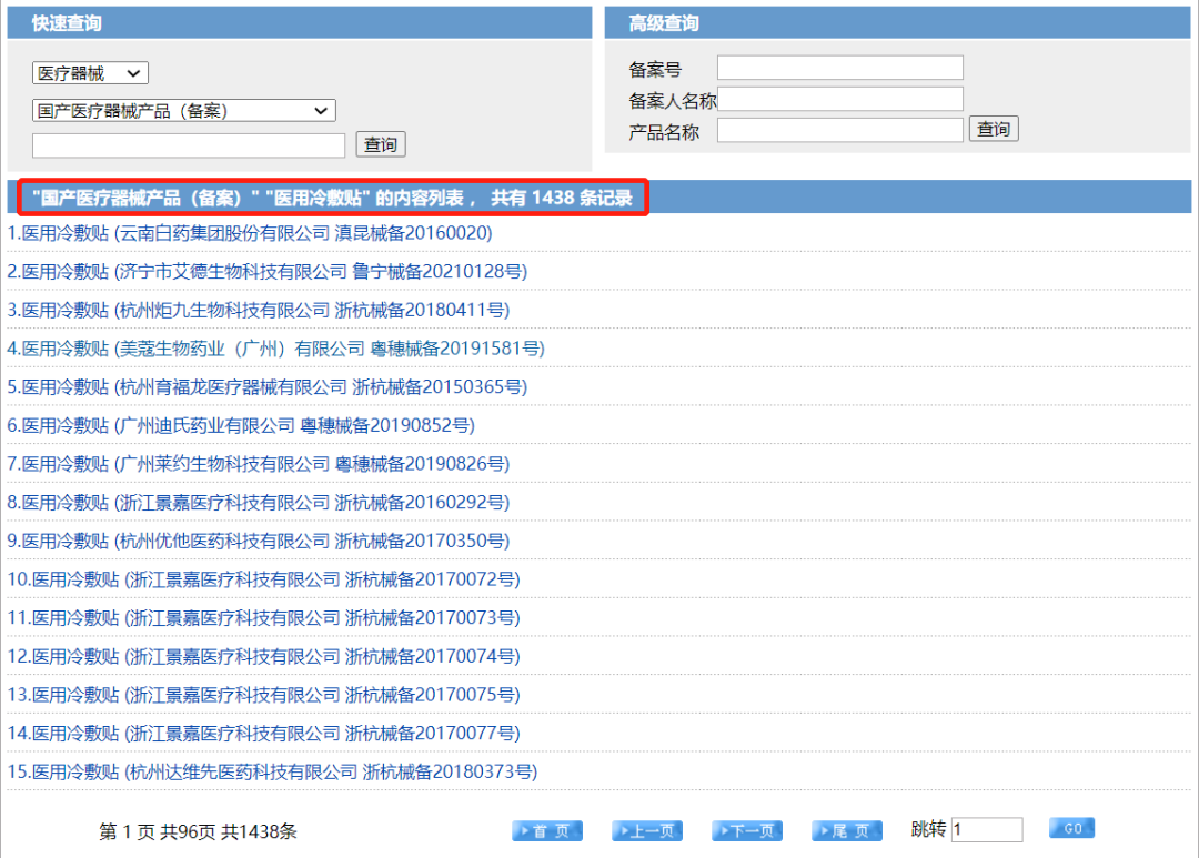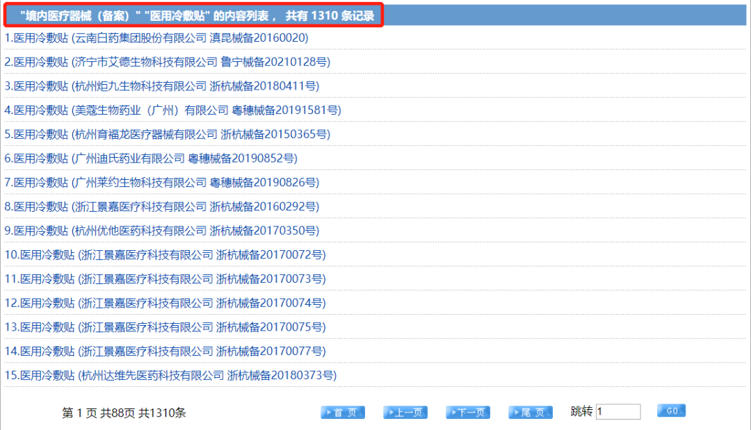 而在市場端,以天貓平臺為例,目前仍然有許多第一類醫(yī)用冷敷貼在售。但根據其中部分產品的備案號,記者在藥監(jiān)局官網中搜索發(fā)現,存在搜索不到備案信息的情況。