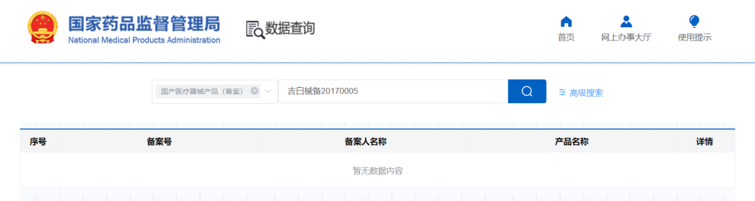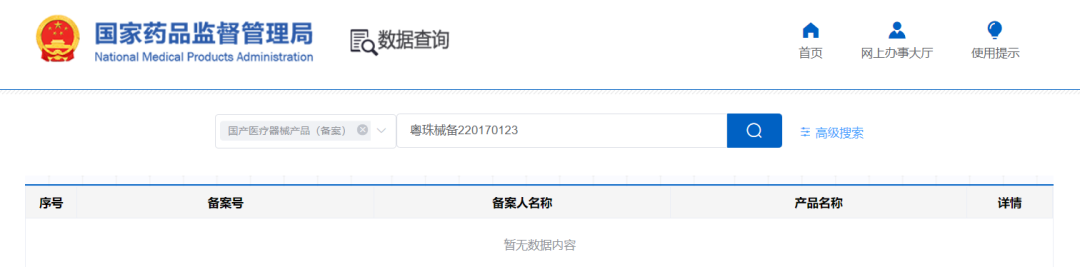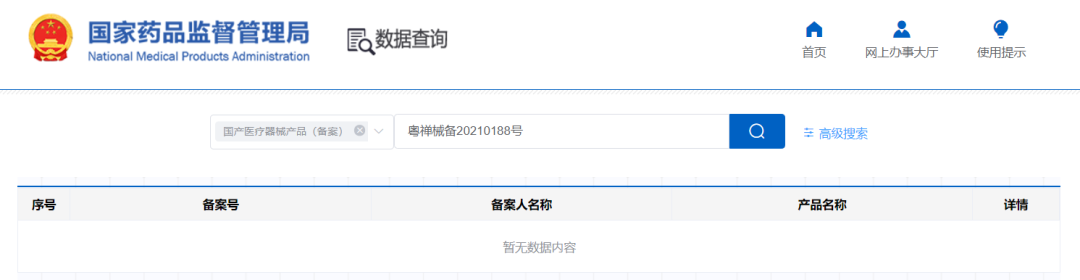 部分在市場端有一定知名度的產品,如菲爾思醫(yī)用光子冷敷貼(吉白械備20170005號)、雅奇醫(yī)用冷敷貼(粵珠械備20170123號)、斐思妮綠膜(粵禪械備20210188號)的搜索結果都為“暫無數據內容”。