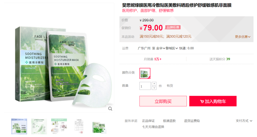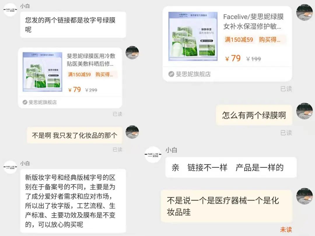 比如,在記者與斐思妮品牌的淘寶店鋪客服溝通的過程中,對方提到,因為藥監(jiān)局政策不斷變更,所以品牌推出了“妝字版”斐思妮綠膜,械字號產品還是會有,但第一類(醫(yī)用冷敷貼)可能不會再有了。