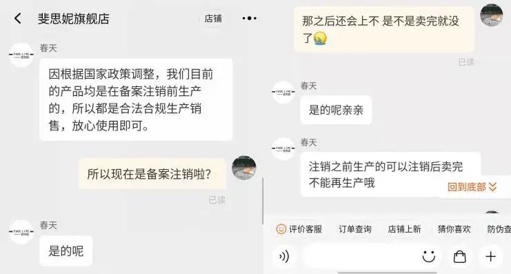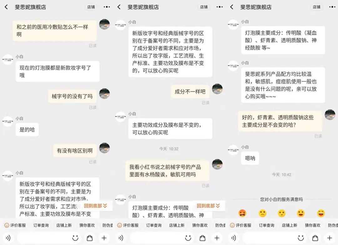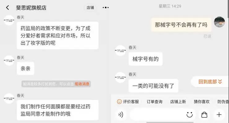 記者向店鋪客服咨詢后對方表示,“新版妝字號和經典版械字號的區(qū)別在于備案號的不同,主要是為了成分愛好者需求和應對市場,所以出了妝字版,工藝流程、生產標準、主要功效及膜布是不變的”。