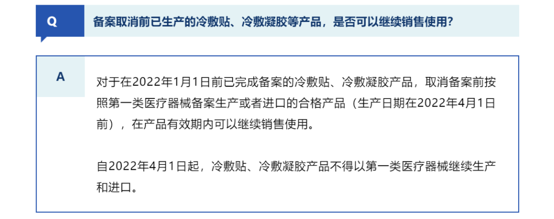 而4月11日,廣東省藥品監(jiān)管局在官方公眾號“廣東藥監(jiān)”發(fā)布文章表示,對于在2022年1月1日前已完成備案的冷敷貼、冷敷凝膠產品,備案取消前按照第一類醫(yī)療器械備案生產或者進口的合格產品(生產日期在2022年4月1日前),在產品有效期內可以繼續(xù)銷售使用。