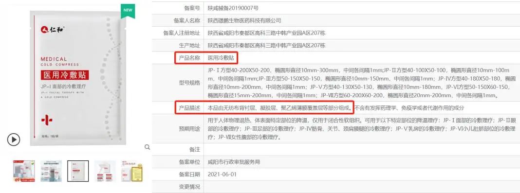 記者隨機查詢發(fā)現,仁和醫(yī)用冷敷貼(陜咸械備20190007號)、活玉醫(yī)用冷敷貼(川蓉械備20170005號)、科優(yōu)妍醫(yī)用冷敷貼(浙湖械備20190053號)、卡其芙醫(yī)用冷敷貼(粵穗械備20210950號)等產品都存在不同程度的問題,比如:仍然使用“醫(yī)用冷敷貼”等產品名稱、成分備案不完整。