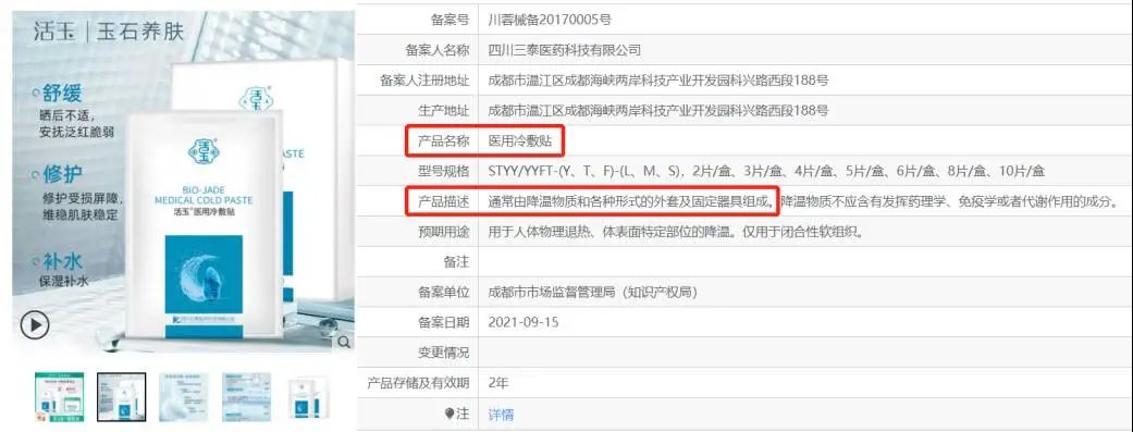 但值得注意的是,在回答中,該責任人提到“對于未添加……等發(fā)揮藥理學、免疫學、代謝作用的成分或者可被人體吸收的成分的冷敷貼、冷敷凝膠產品,如預期用于完整皮膚,緩解扭傷、碰撞等引起的的疼痛、腫脹等,按照第二類醫(yī)療器械管理”,而化妝品/醫(yī)美市場中出現的醫(yī)用冷敷貼,其實際用途主要為:舒緩由過敏、醫(yī)美治療等引起的面部皮膚的發(fā)熱、紅腫等,兩者之間的作用目的差距甚大。