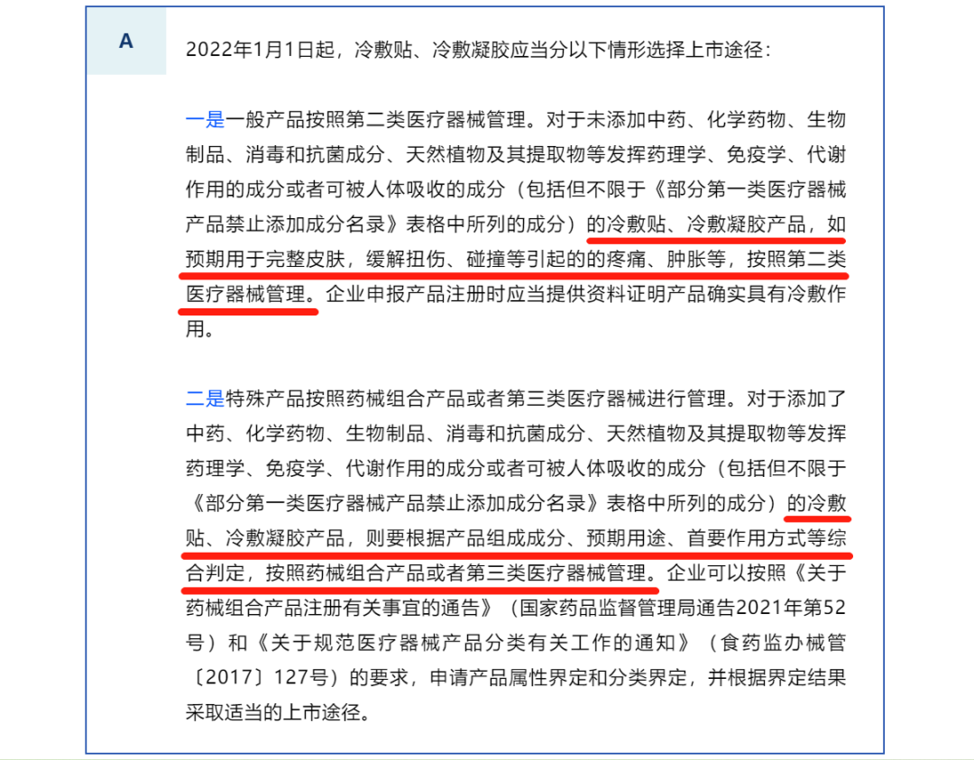 另外,在這篇文章中,國家藥監(jiān)局器械注冊司、器械監(jiān)管司相關負責人還解答了“新《一類目錄》實施后,冷敷貼、冷敷凝膠產品,應當采取什么途徑上市?”這一問題。解答內容顯示,“一般產品按照第二類醫(yī)療器械管理”,“特殊產品按照藥械組合產品或者第三類醫(yī)療器械進行管理”。