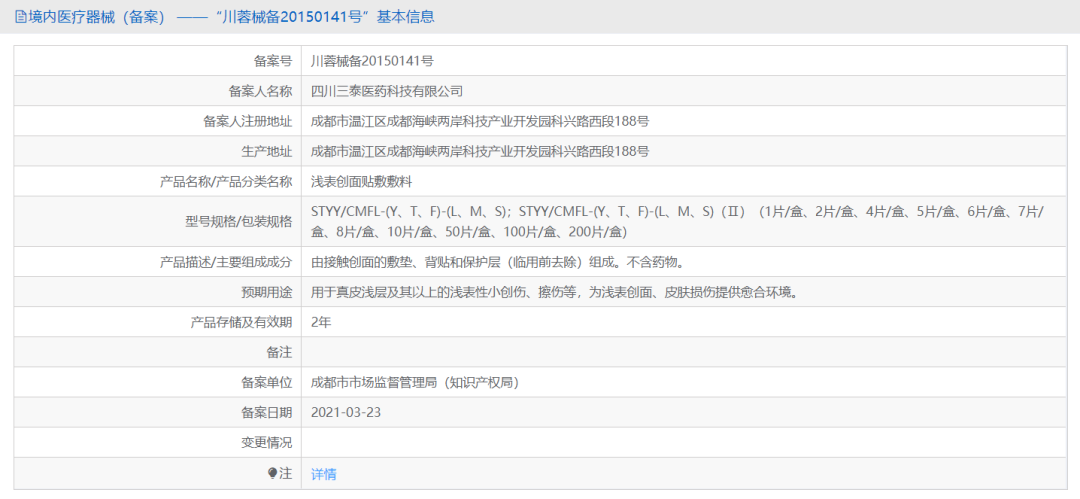 根據備案號搜索到的信息顯示,這款產品的名稱為“淺表創(chuàng)面貼敷敷料”,“由接觸創(chuàng)面的敷墊、背貼和保護層(臨用前去除)組成,含藥物”,預期用途為“用于真皮淺層及其以上的淺表性小創(chuàng)傷、擦傷等,為淺表創(chuàng)面、皮膚損傷提供愈合環(huán)境”。