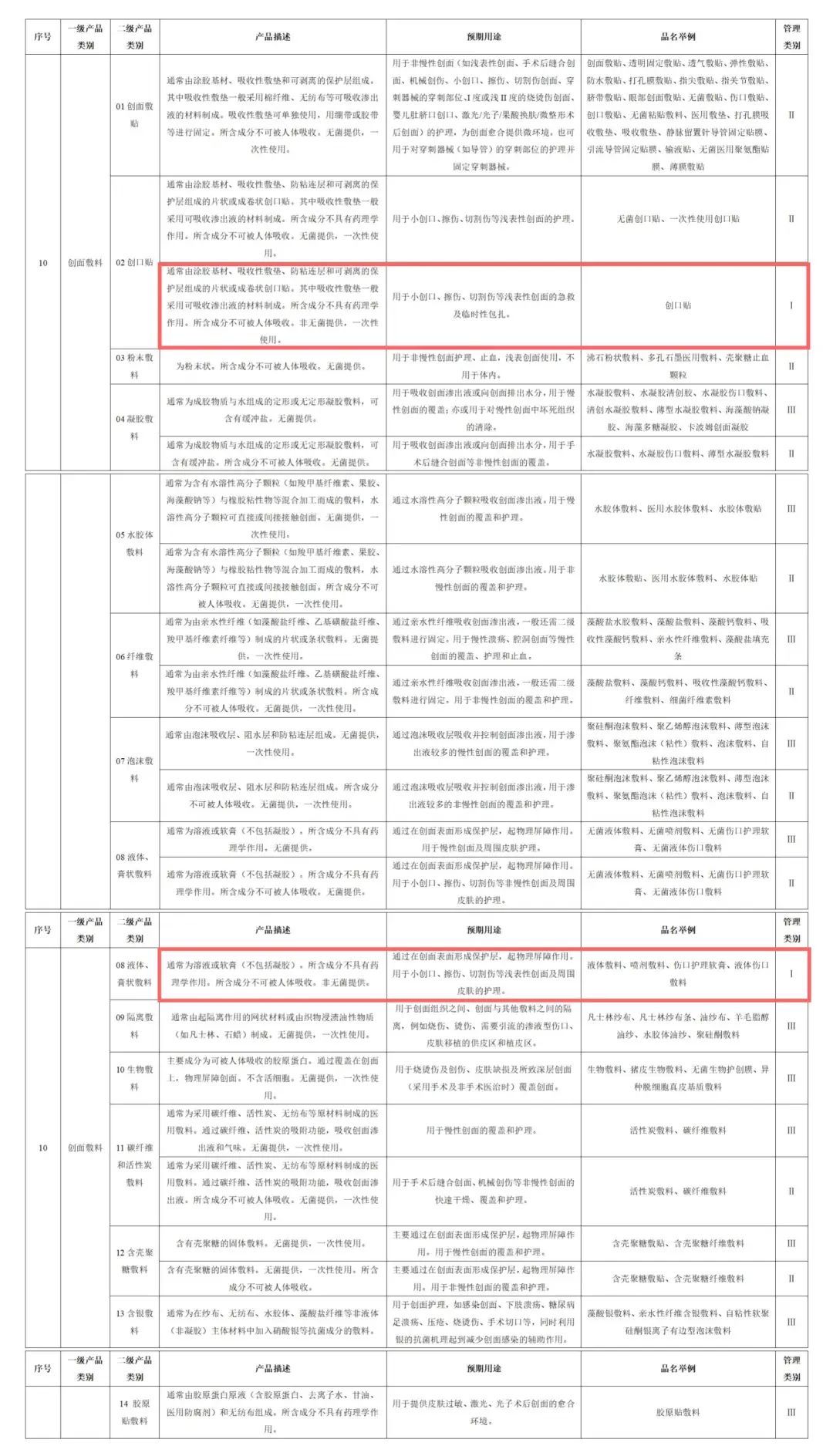但記者查詢了2017版的《醫(yī)療器械分類目錄》,發(fā)現在用于創(chuàng)面護理的14-10創(chuàng)面敷料分類中,絕大多數的醫(yī)療器械都需要以二、三類來進行注冊,如下圖所示,可以以第一類醫(yī)療器械備案只有14-10-02創(chuàng)口貼和14-10-08液體、膏狀敷料。