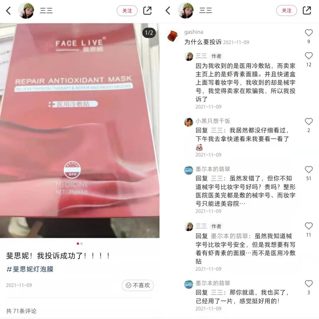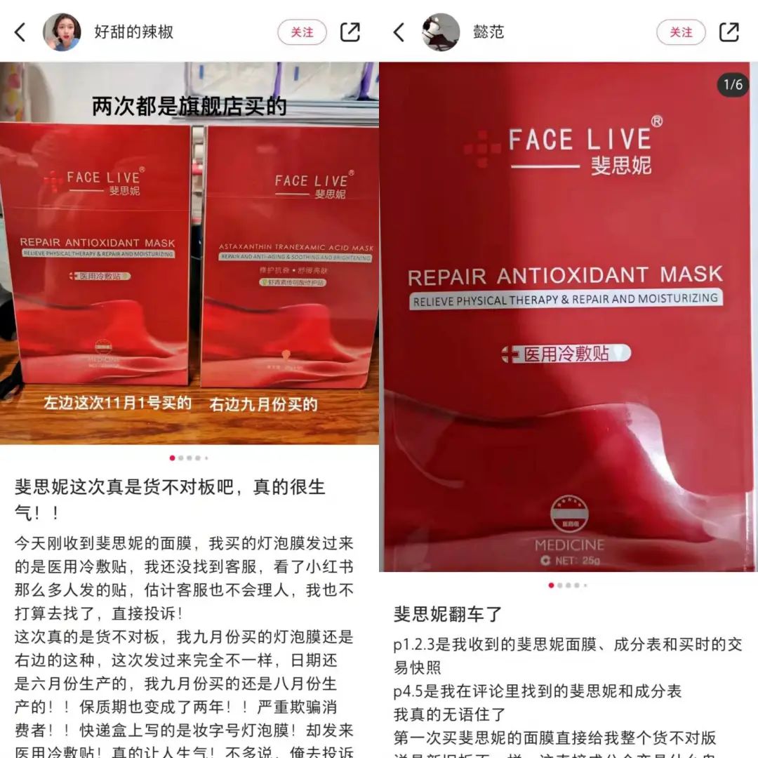 多位小紅書網友發(fā)帖表示,自己購買的是蝦青素傳明酸修復貼,收到的卻是醫(yī)用冷敷貼,產品貨不對板。這在一定程度上證明了斐思妮曾存在“同一鏈接,妝械混賣”的情況。