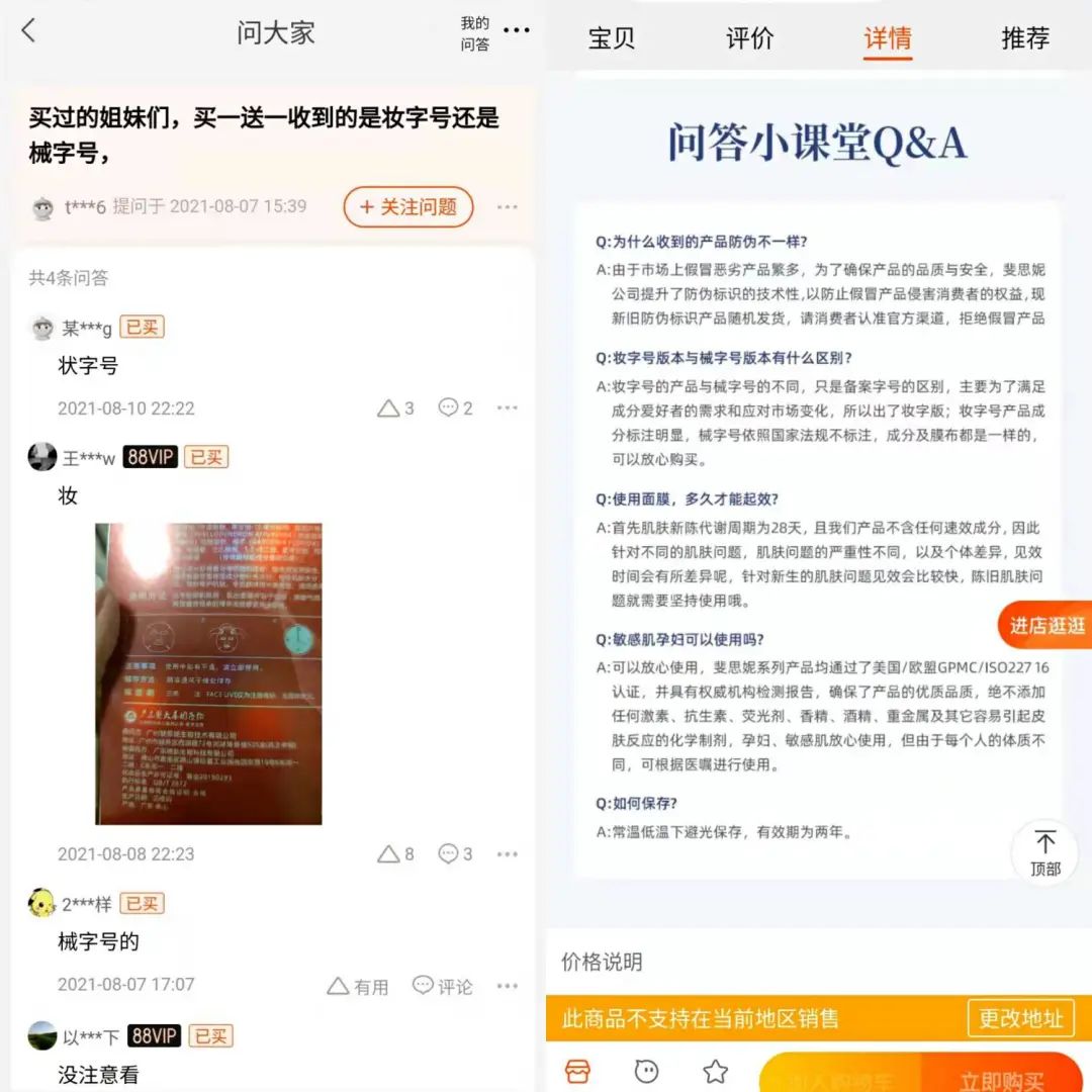 當前,在斐思妮天貓官方店鋪“蝦青素傳明酸修復貼”購買鏈接下,據消費者回答可見,2021年8月左右,消費者在同一個產品鏈接中下單,可能收到妝字號、械字號兩種不同的產品。