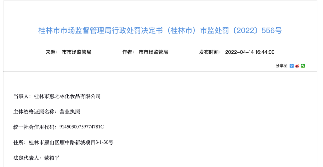《決定書(shū)》顯示,桂林市市場(chǎng)監(jiān)督管理局依據(jù)日常監(jiān)督檢查職權(quán),于2022年2月22日至3月1日依法對(duì)惠之林化妝品經(jīng)驗(yàn)管理情況進(jìn)行檢查,發(fā)現(xiàn)該公司在化妝品入庫(kù)查驗(yàn)環(huán)節(jié)未對(duì)特殊化妝品注冊(cè)編號(hào)或者普通化妝品備案編號(hào)進(jìn)行現(xiàn)場(chǎng)查驗(yàn)并記錄,違反了《化妝品生產(chǎn)經(jīng)營(yíng)監(jiān)督管理辦法》第三十九條規(guī)定。