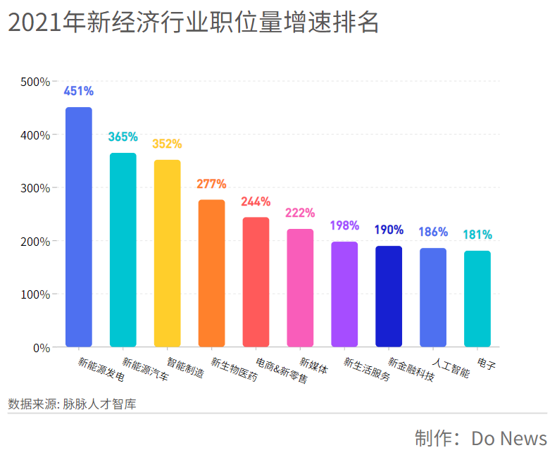 根據(jù)脈脈人才智庫數(shù)據(jù)顯示,在2021年新增職位量最多的新經(jīng)濟行業(yè)中,新能源汽車行業(yè)高居亞軍,新增職業(yè)量同比增長365%。