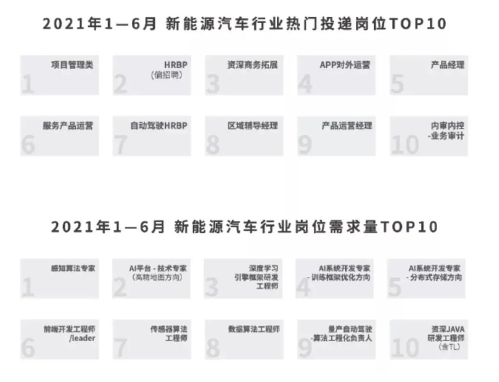 根據(jù)脈脈研究院發(fā)布的《新能源汽車人才啟示錄》可知,去年上半年汽車行業(yè)需求量最大的崗位,是感知算法專家、AI平臺技術(shù)專家、深度學習引擎框架研發(fā)工程師等研發(fā)崗位。但投遞量最大的崗位,則是項目管理、HR、商務拓展等非研發(fā)崗,供需脫節(jié)。