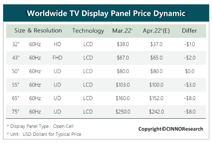 市場下跌趨勢還在繼續(xù),記者查詢了Omdia、WitsView、Sigmaintel(群智咨詢)、奧維睿沃、CINNO Research等機(jī)構(gòu)最新預(yù)測數(shù)據(jù),分析結(jié)果均顯示,4月份電視用LCD面板的報(bào)價(jià)預(yù)計(jì)將繼續(xù)連續(xù)下降。以CINNO Research數(shù)據(jù)為例,他們預(yù)計(jì),4月份32、43、55英寸LCD電視面板價(jià)格將較3月份下跌1-3美元/片,分別達(dá)到37、65、100美元/片;65、75英寸LCD電視面板價(jià)格將出現(xiàn)8美元/片的下跌,分別達(dá)到152、242美元/片。