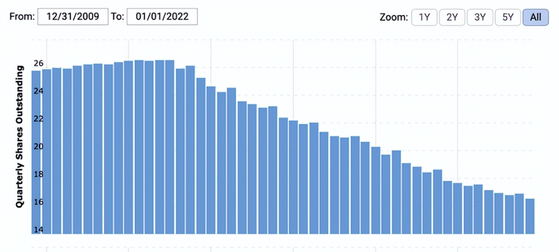 蘋果已成為股票回購的典型代表。自該計劃于 2012 年啟動以來,該公司已斥資4670 億美元,成為所有公司股票回購支出最多的公司。通過這種方式,除了管理員工成本(從 RSU 稀釋)之外,該公司已成功將其流通股從 260 億股減少到大約 160 億股。