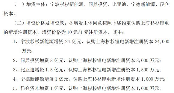 此次增資公告透露了更多細(xì)節(jié)。具體來看,四位戰(zhàn)略投資人——問鼎投資、比亞迪、寧德新能源(ATL)、昆侖資本分別增資3億元、1.5億元、1億元、1億元,對應(yīng)分別認(rèn)購上海杉杉鋰電新增注冊資本3000萬元、1500萬元、1000萬元、1000萬元。
