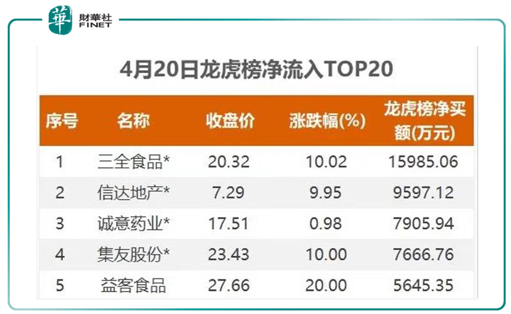 以龍虎榜凈流入資金統(tǒng)計4月20日情況,三全食品的龍虎榜凈買入額最大(見下表,筆者在TOP20里截取了前5名)