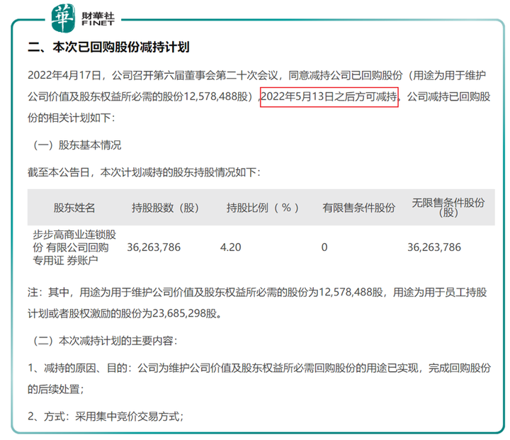 同時,步步高自身也想在高位減持套現(xiàn)。步步高日前公告稱(4月19日《關(guān)于出售回購股份的公告》),公司擬減持去年回購的12,578,488股,2022年5月13日之后方可減持。
