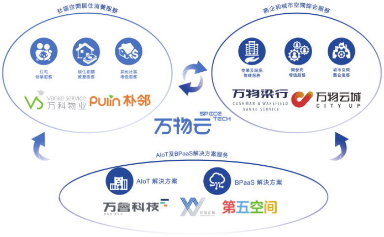 其中,社區(qū)空間居住消費(fèi)服務(wù)主要指傳統(tǒng)的社區(qū)物業(yè)服務(wù),主要通過“萬科物業(yè)”品牌進(jìn)行;商企和城市空間綜合服務(wù)是指商業(yè)物業(yè)服務(wù)以及城市空間整合服務(wù)。此外,萬物云還開發(fā)了系列遠(yuǎn)程空間科技運(yùn)營服務(wù),也就是“人工智能物聯(lián)網(wǎng)”(AIoT)以及“流程即服務(wù)”(BPaaS)解決方案服務(wù)。