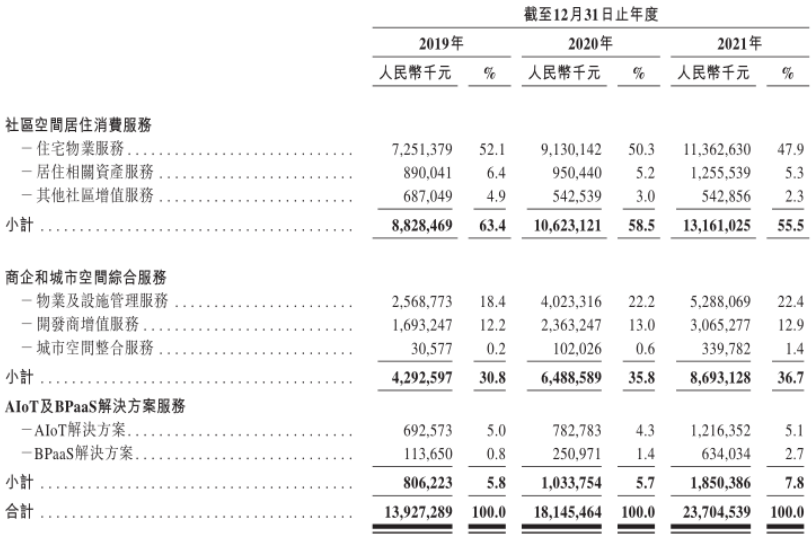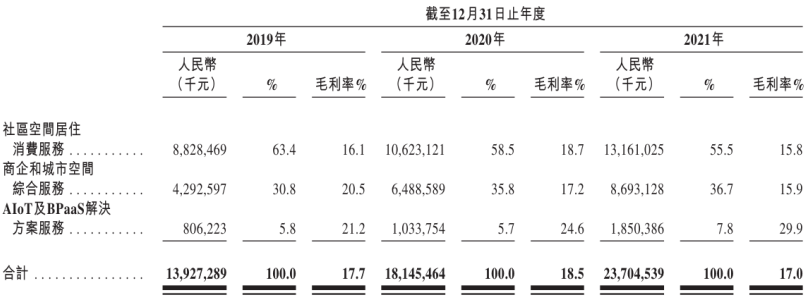 從營收構(gòu)成上看,萬物云主營收入共分為社區(qū)空間居住消費(fèi)服務(wù)、商企和城市空間綜合服務(wù)和AIoT及BPaaS解決方案服務(wù)三大板塊。