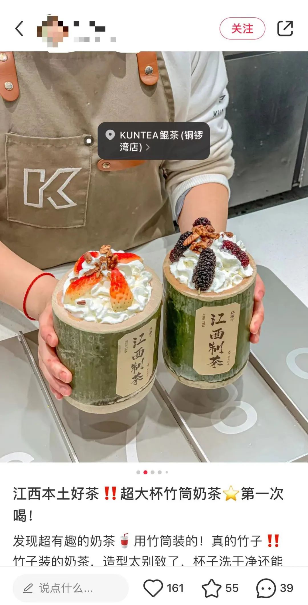比如來自江西南昌的KUNTEA鯤茶,老板是在同濟待過的土木碩士,設計過橋梁,拿過國獎,當過上海優(yōu)秀畢業(yè)生。在江西吉安遂川高塘小學支教時,他受當?shù)厣剿栉幕绊?,和團隊推出了在社交媒體大火的「竹筒奶茶」,并隨之在當?shù)刂匾倘︺~鑼灣、萬象匯等點位鋪開。