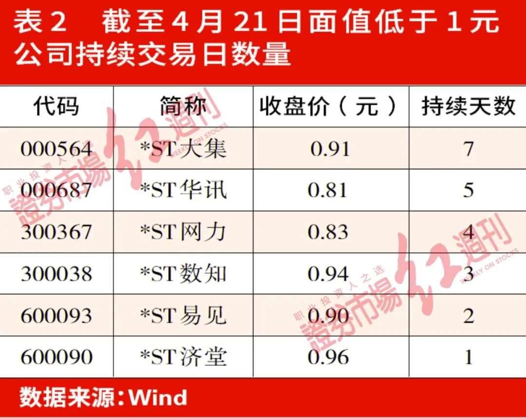 與財(cái)務(wù)類強(qiáng)制退市的“陣容”相比,像*ST艾格那樣因?yàn)榻灰變r(jià)格低于1元而面臨退市的個(gè)股也很多。據(jù)Wind統(tǒng)計(jì),截至4月21日收盤(pán),*ST網(wǎng)力、*ST華訊、*ST數(shù)知、*ST大集、*ST易見(jiàn)和*ST濟(jì)堂6家公司的收盤(pán)價(jià)均在0.80元~1元區(qū)間。尤其是*ST大集,目前股價(jià)報(bào)0.91元/股,已連續(xù)七個(gè)交易日收盤(pán)價(jià)低于1元。(見(jiàn)表2)。