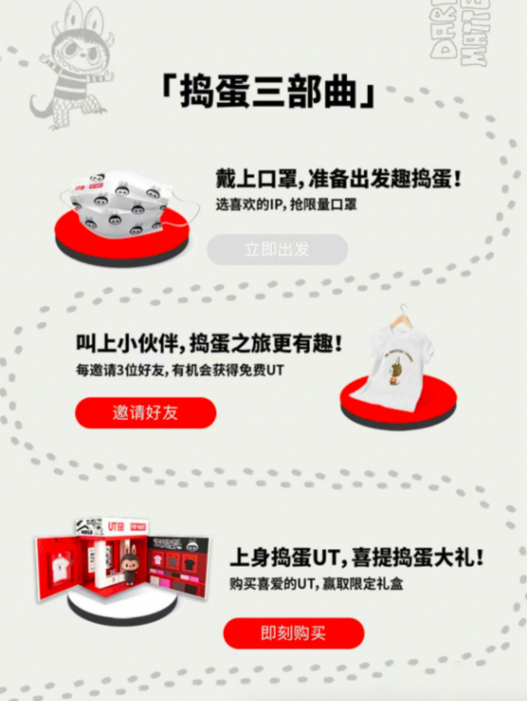 在玩法上,優(yōu)衣庫充分迎合潮玩圈層的心理,根據(jù)LABUBU調(diào)皮搗蛋的特點制作了UT趣味館,用戶參與「搗蛋三部曲」活動,完成對應(yīng)互動任務(wù),將有機會免費獲得聯(lián)名款口罩、壁紙、發(fā)箍、T恤和限定禮盒,這讓一些玩家眼前一亮。