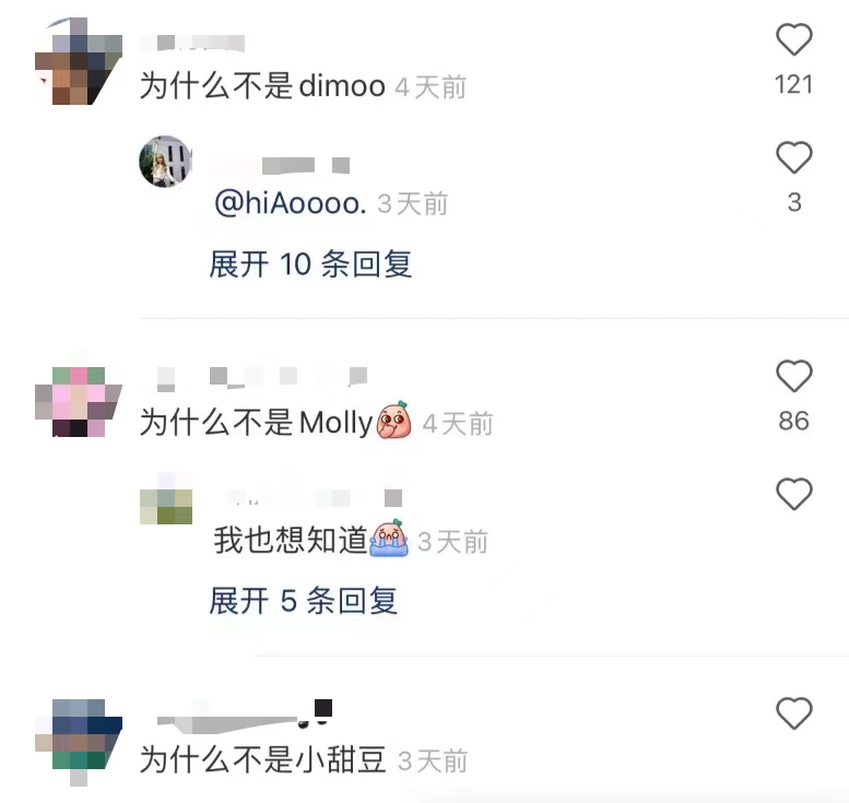 有粉絲表示,“為什么不是Dimoo,為什么不是Molly?”“看了可以說再見了,如果是Molly的話,銷量會直接拉滿?!薄安皇俏液芟矚g的,省錢了。”