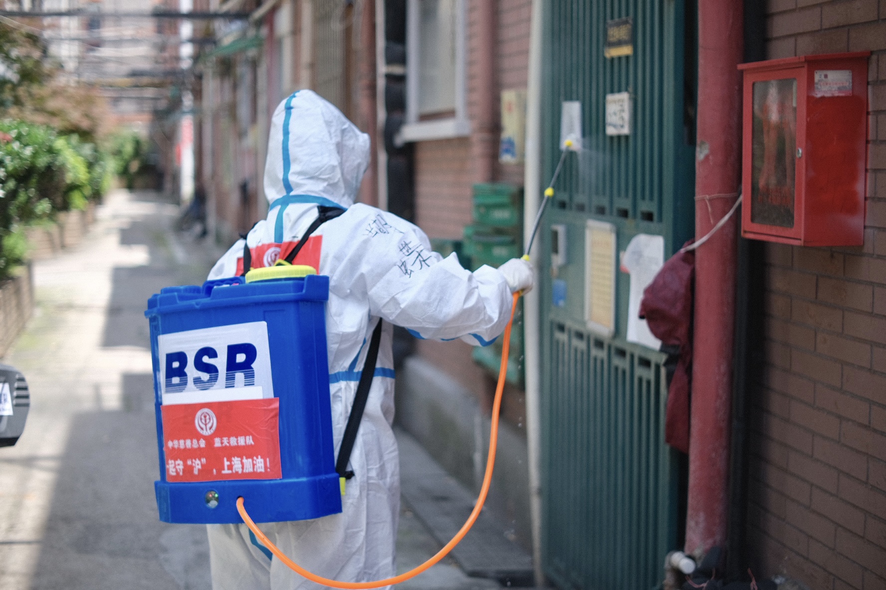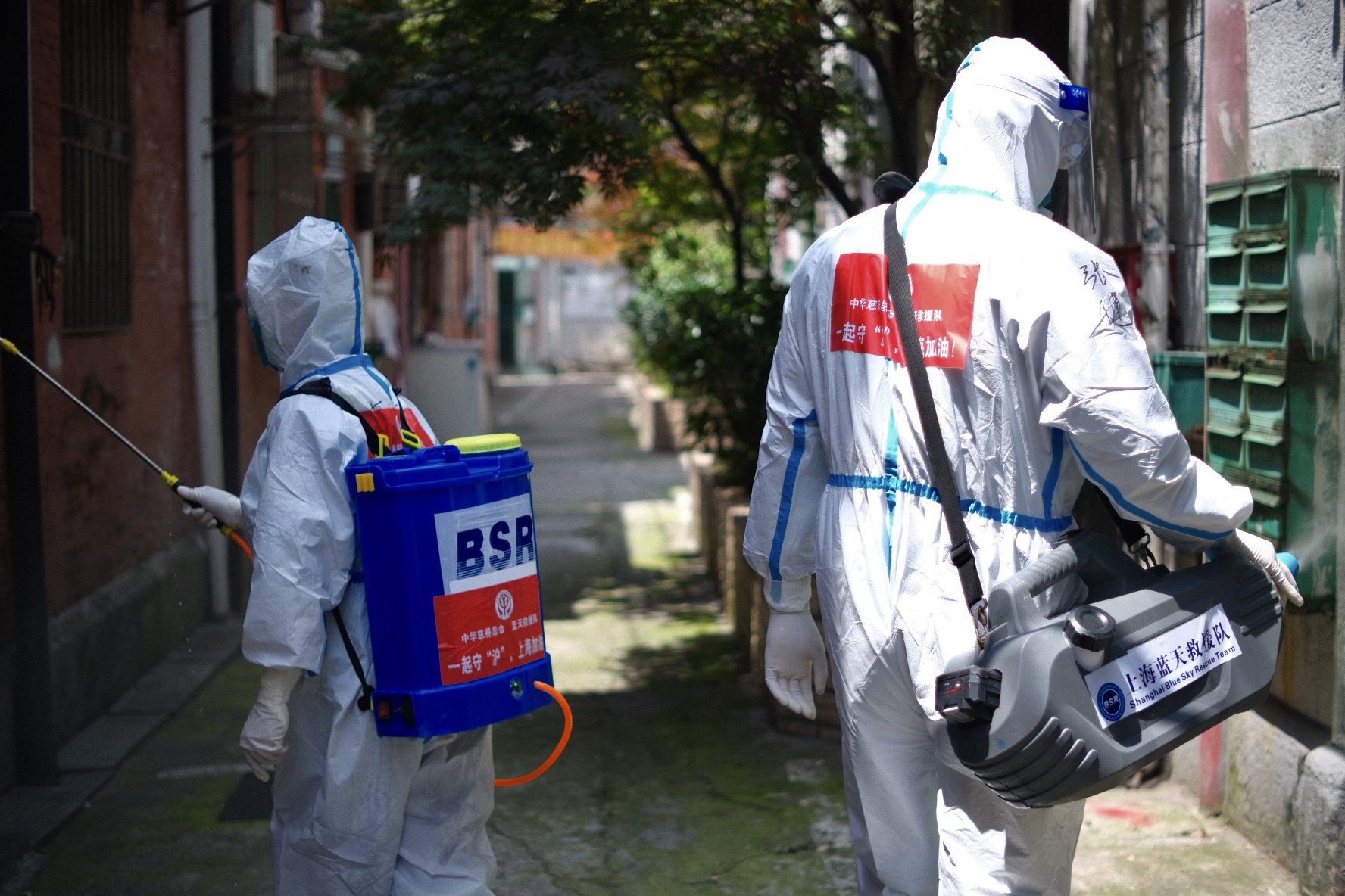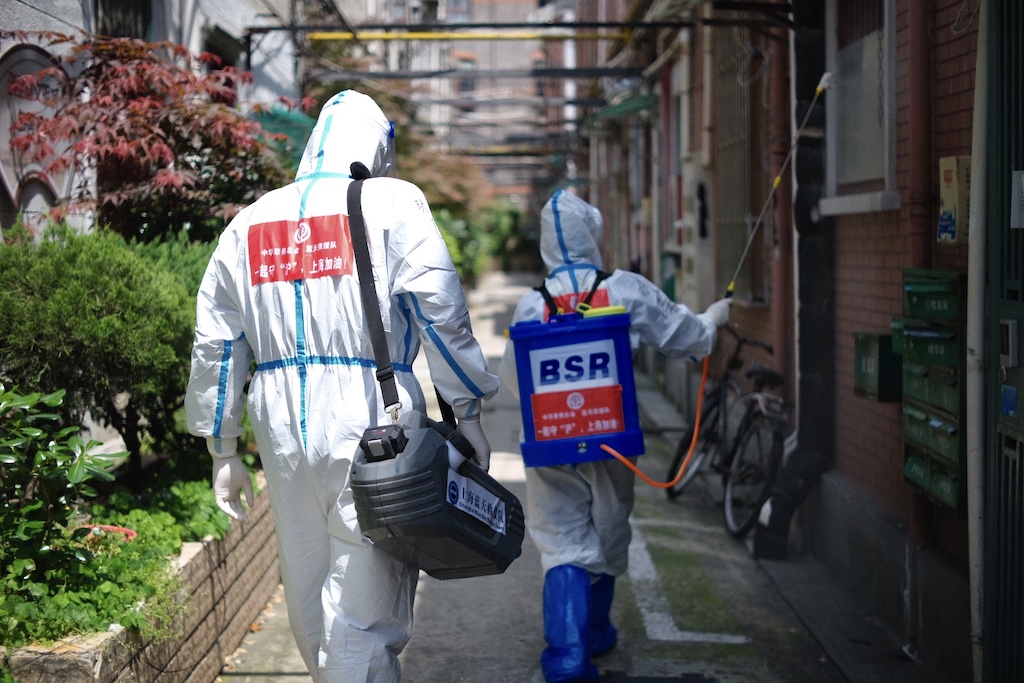 小區(qū)道路、樓棟大門、快遞柜、信報(bào)箱……2022年5月1日,上海南蘇州路上,6名背著消殺水箱的隊(duì)員一字排開,打開噴霧裝置開始消殺,不漏過一個(gè)死角。