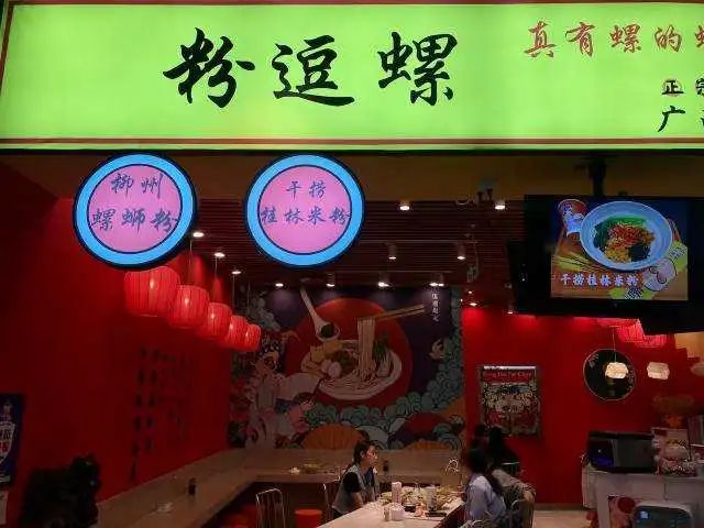 都玩過紅斗羅吧,一家品牌連鎖米粉店取名“粉斗螺”,既諧音了游戲名,有突出了螺螄粉的廣西特色。