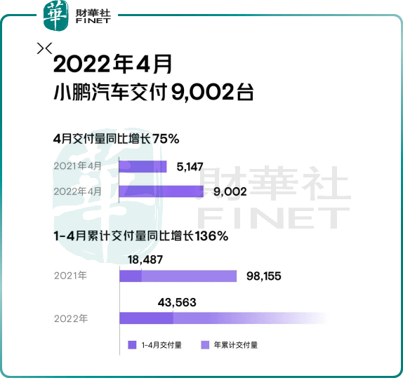4月,小鵬汽車交付9002臺(tái),環(huán)比下滑41.6%,同比增長(zhǎng)75%。2022年1-4月,小鵬汽車?yán)塾?jì)交付43563臺(tái),同比增長(zhǎng)136%。