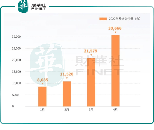 官方稱,4月共交付新車9087輛,已連續(xù)13個(gè)月同比增長(zhǎng)超過200%。2022年1-4月累計(jì)交付量為30666輛,同比增長(zhǎng)達(dá)419%。