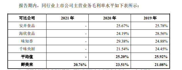 2019年和2021年,鮮美來(lái)毛利率分別為21.08%、23.51%、20.76%。和同行相比,鮮美來(lái)的毛利率略顯偏低。