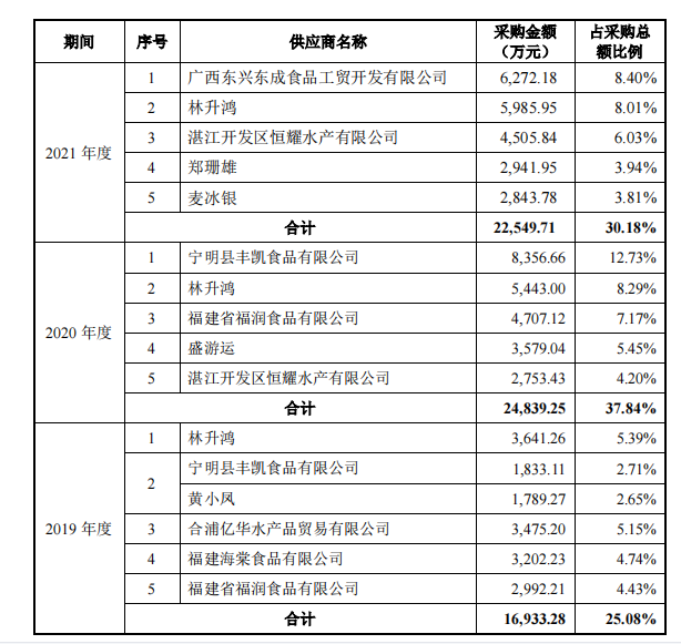 作為一家水產(chǎn)品公司,鮮美來(lái)原材料采購(gòu)中最主要的原料是冰鮮蝦和凍鮮蝦仁,各年占比均在60%以上。按理說(shuō),鮮美來(lái)的幾大供應(yīng)商應(yīng)該是比較穩(wěn)定的,但實(shí)際上,鮮美來(lái)的供應(yīng)商卻十分分散,且引起了監(jiān)管的注意。