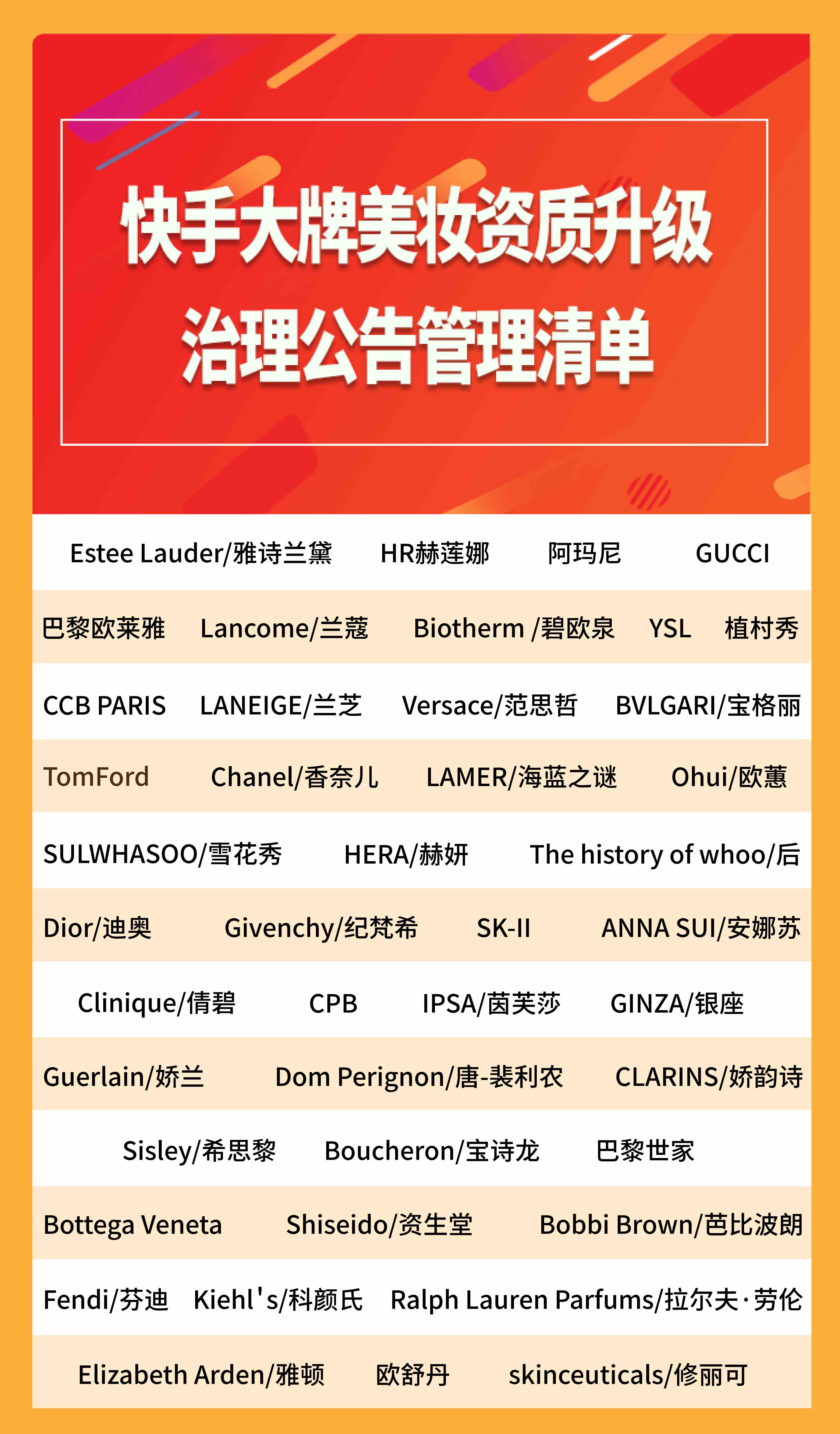 不久前,快手發(fā)布《大牌美妝資質(zhì)升級治理公告》,宣布從5月1日起,針對售賣國際知名化妝品品牌的商戶進行資質(zhì)升級治理,包括蘭蔻、雅詩蘭黛、海藍之謎、香奈兒等45個國際品牌,被列入管理清單。