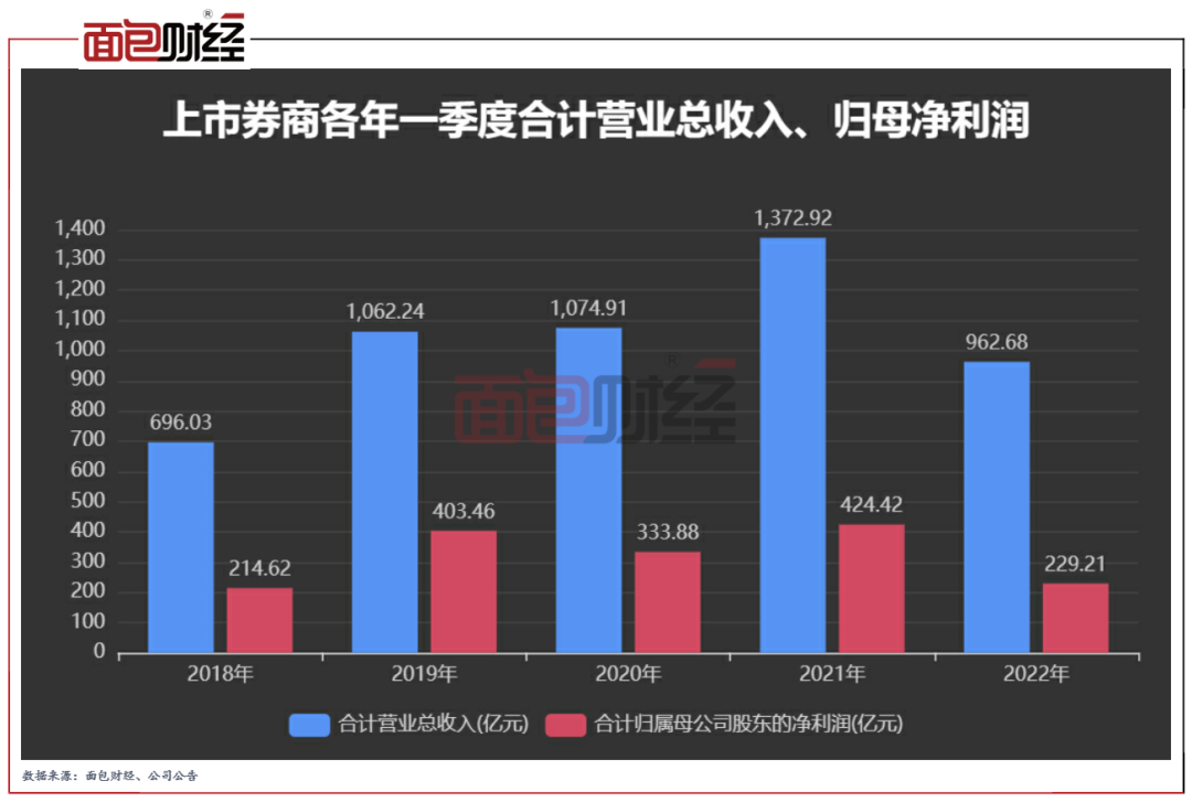 2022年一季度,41家上市券商合計(jì)產(chǎn)生營(yíng)收和歸母凈利潤(rùn)962.68億元和229.21億元,同比分別下降約30%和45%。