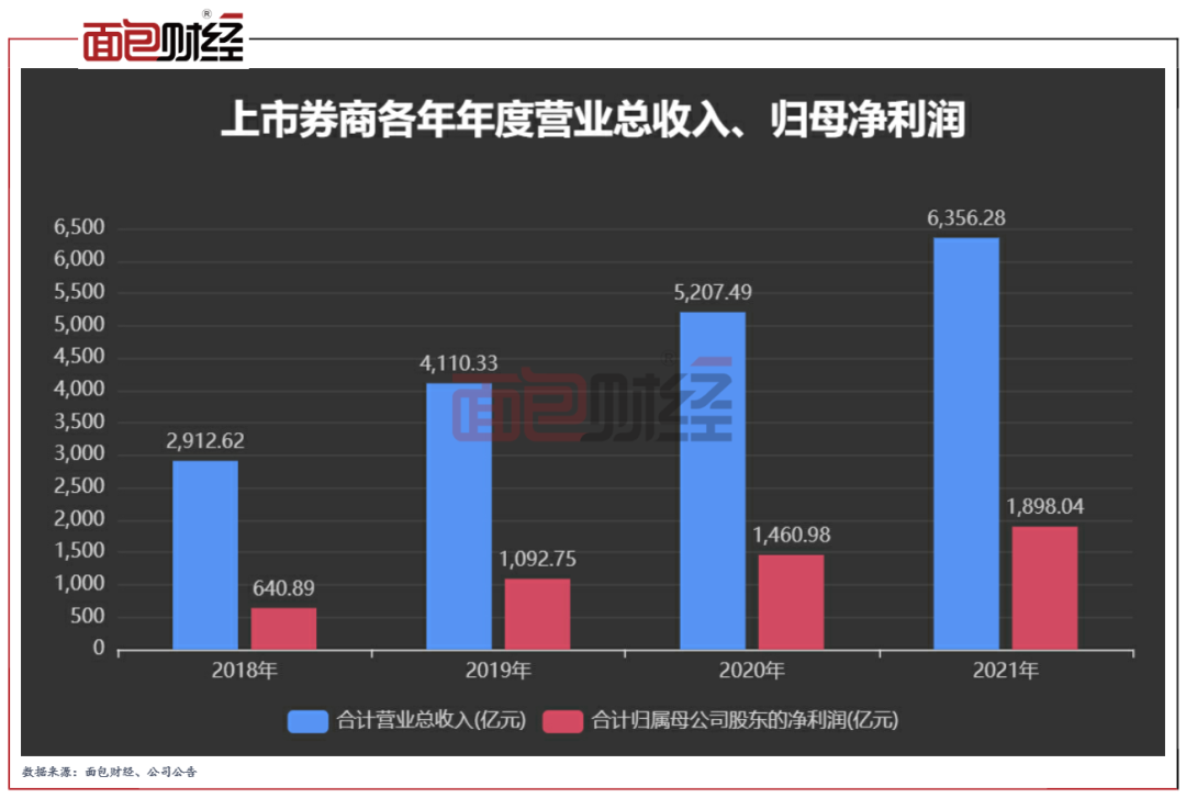 2021年,上市券商合計(jì)分別產(chǎn)生營(yíng)收和歸母凈利潤(rùn)6356.28億元和1898.04億元,同比分別上升約22%和30%,整體業(yè)績(jī)有所增長(zhǎng)。