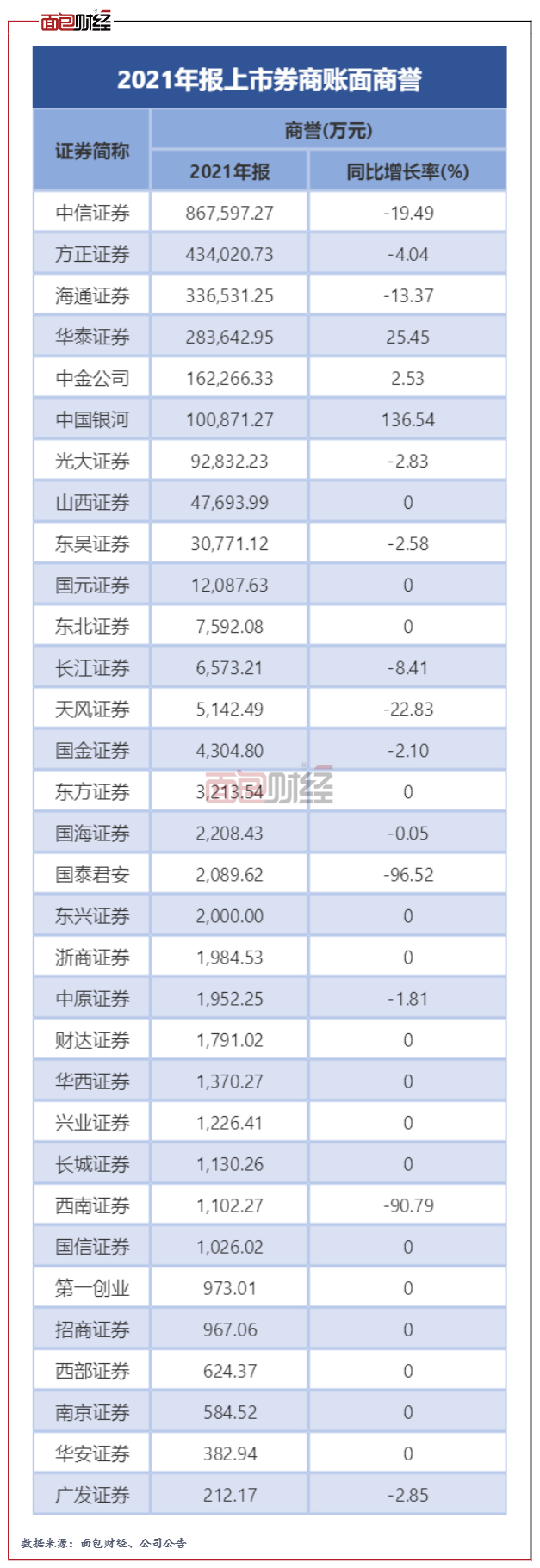 截止2021年年末,中信證券賬面上持有商譽(yù)86.76億元,主要源自收購(gòu)華夏基金。此外,還有方正、海通、華泰等5家上市券商的商譽(yù)超過(guò)10億元。