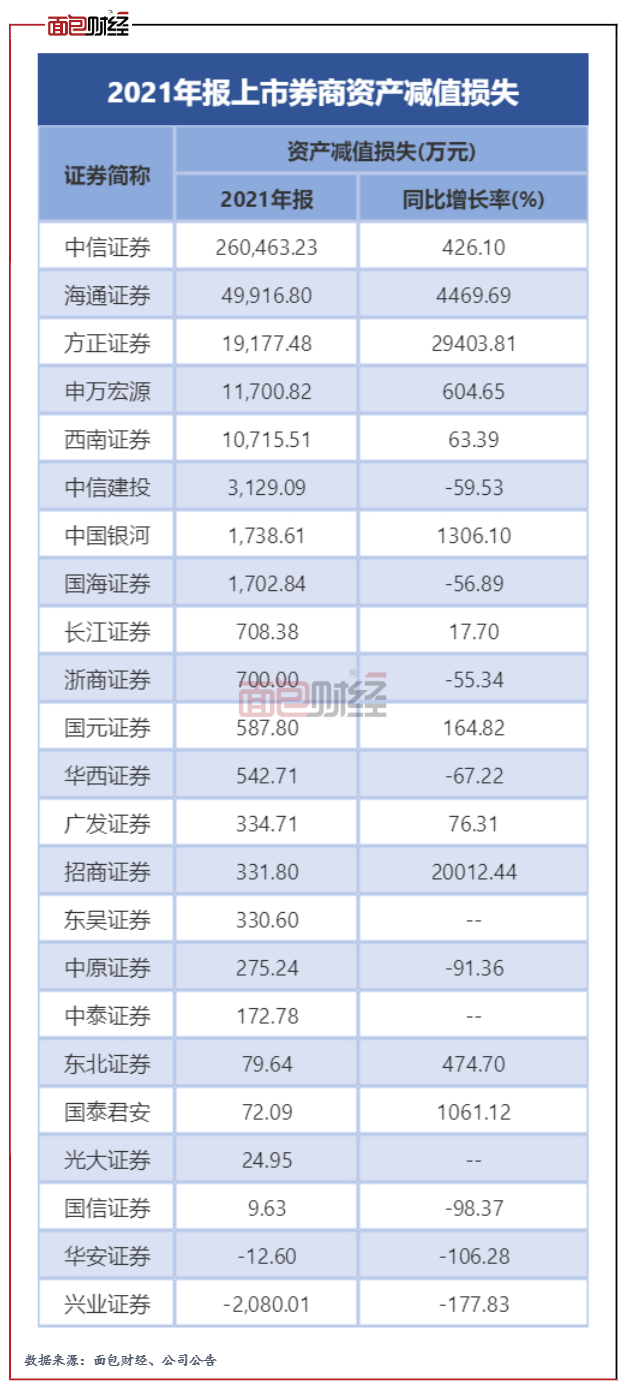 風(fēng)險(xiǎn)管理方面,截止2021年年末,中信、方正、海通證券的賬面商譽(yù)超過(guò)30億元,規(guī)模較大。與之相應(yīng)的,三家券商當(dāng)期確認(rèn)較大金額的資產(chǎn)減值損失。另外,海通、東方證券當(dāng)期發(fā)生信用減值損失均超過(guò)10億元。