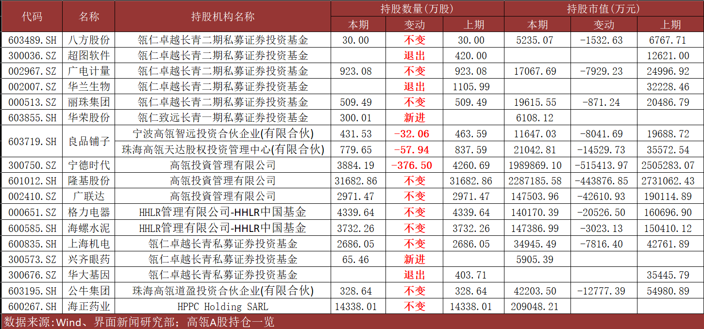 一季度,高瓴仍堅定持有隆基股份、海正藥業(yè)、廣聯(lián)達(dá)、格力電器、海螺水泥、公牛集團、上海機電、麗珠集團、廣電計量、八方股份等10只個股,且相較去年底持股數(shù)量未發(fā)生變化。