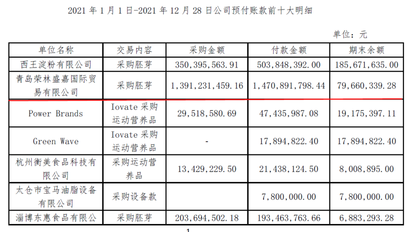 公告數(shù)據顯示,2021年1月1日至12月28日,西王食品向榮林盛嘉采購胚芽13.91億元,與年報披露的第一大供應商采購金額相差約1億元,這個差異要么是后期有退貨,要么是增值稅差異,但有一點是毫無疑問的,西王食品2021年的第一大供應商是榮林盛嘉。