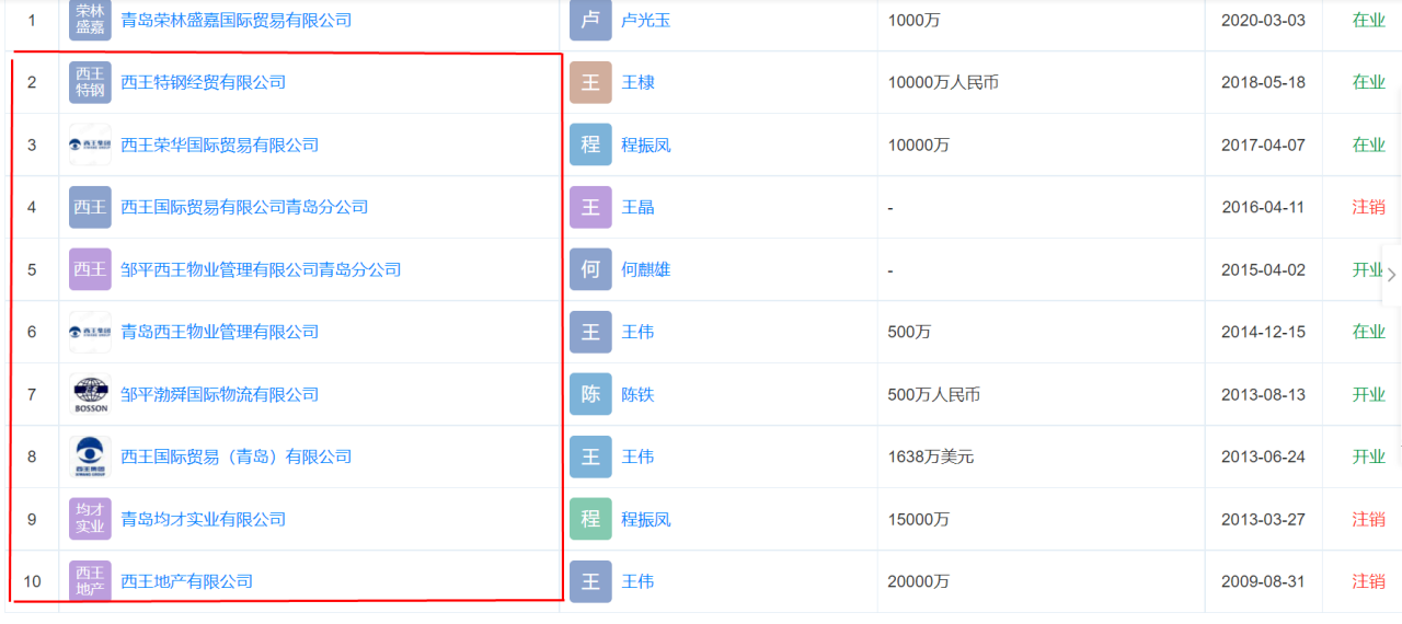 其中西王特鋼經貿公司、西王國際貿易公司是西王集團旗下產業(yè),與西王食品是兄弟公司,西王特鋼經貿公司法人代表王棣是西王集團副董事長,他曾出任過西王食品董事長,目前仍然是西王食品控股子公司西王食品(青島)有限公司的法人代表。西王物業(yè)是西王系成員,為西王建工旗下產業(yè),據財報披露,該公司目前是西王食品債務擔保人之一。
