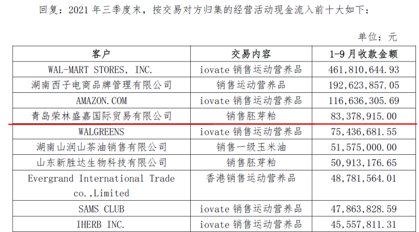 根據西王食品對深交所問詢函回復意見,2021年前三季度,西王食品對榮林盛嘉的銷售回款金額為8337.89萬元,位列第四名: