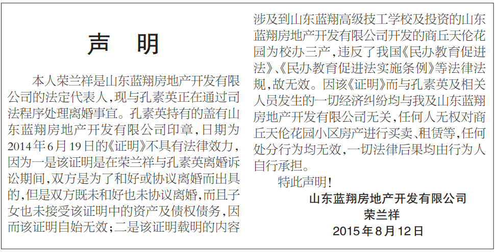 2014年6月19日,榮蘭祥、孔素英與6個孩子簽訂了一個《證明》文件,提出將榮蘭祥名下所有山東藍(lán)翔房地產(chǎn)開發(fā)有限公司及河南天倫花園工程項(xiàng)目、商丘310公路南藍(lán)翔加油站、山東藍(lán)翔高級技工學(xué)校、山東宏達(dá)技校、山東藍(lán)翔職業(yè)技術(shù)培訓(xùn)學(xué)校的全部資金資產(chǎn)和債權(quán)債務(wù)歸子女所有。