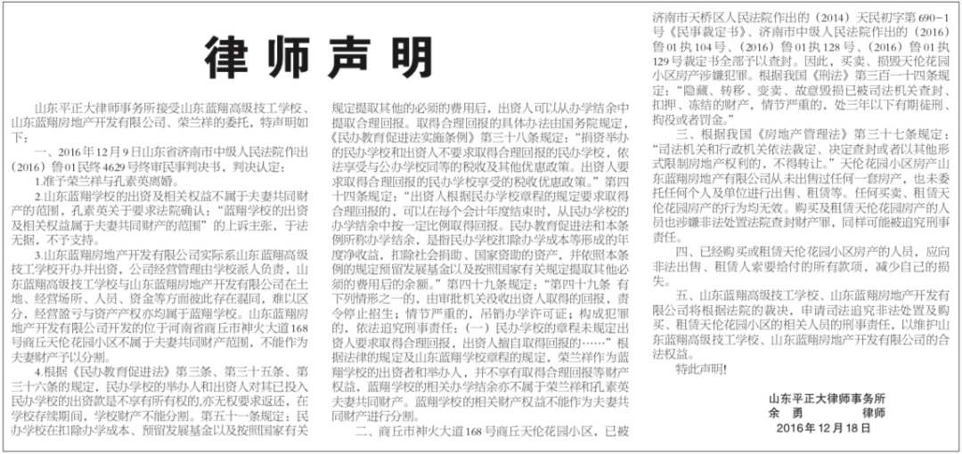 對于該判決結(jié)果,2016年12月18日,山東平正大律師事務(wù)所亦在《商丘日報(bào)》上進(jìn)行了登報(bào)聲明。